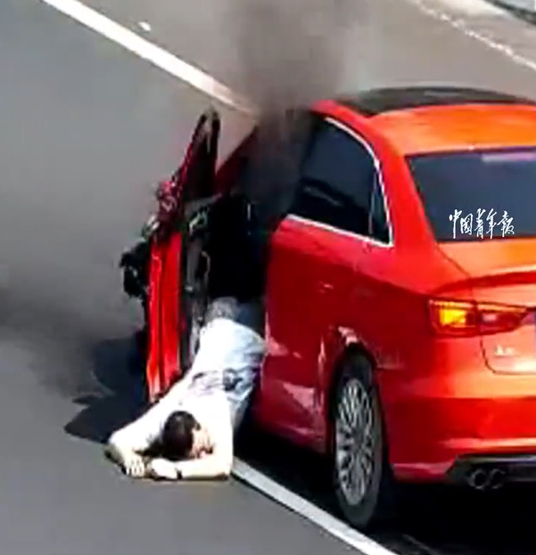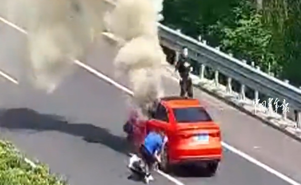 車流如織的高速公路上,危險毫無征兆地降臨。一輛轎車突發(fā)事故,車頭瞬間被滾滾濃煙吞噬,駕駛員在車內(nèi)掙扎,試圖推開車門自救,可濃煙嗆得他咳嗽不止,體力迅速流失,車門只開了半扇,他卻已沒了脫身的力氣。