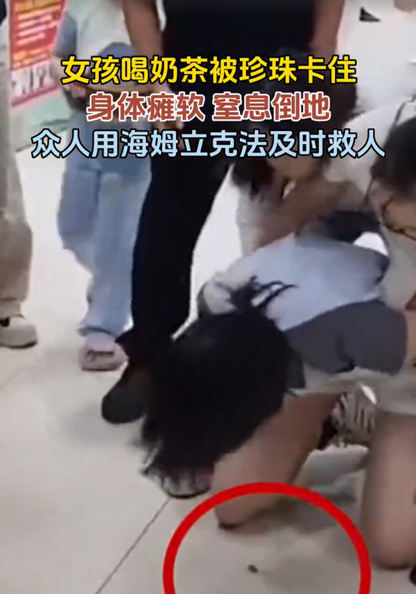 重慶一女孩喝珍珠奶茶時意外窒息,危急時刻,周圍眾人迅速用海姆立克法接力施救,成功幫她排出堵塞的珍珠,化險為夷。
