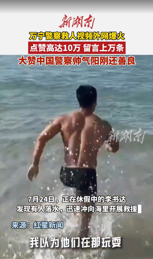 近日,一段中國警察休假勇救落水者的視頻在國外社交平臺(tái)爆火!視頻中,海南省萬寧市公安局民警李書達(dá)在海邊休假時(shí),發(fā)現(xiàn)有人落水,毫不猶豫地沖向大海施救。這英勇一幕被拍下后,瞬間在國外引發(fā)熱議,點(diǎn)贊量逼近10萬,留言上萬條。外國網(wǎng)友紛紛留言:“他簡直是超級(jí)英雄!”“中國警察真是帥氣又善良!”