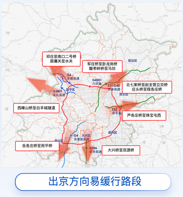 此外,9月30日下午15時(shí)起城市路網(wǎng)交通量將明顯加大,17時(shí)至19時(shí)路網(wǎng)壓力最為突出。城區(qū)東西部主要環(huán)路北向南,蓮石東路、通惠河北路、豐體南路等聯(lián)絡(luò)線,京藏、京承、京開、京港澳、機(jī)場(chǎng)高速等主要高速公路出京方向及六環(huán)路部分路段易出現(xiàn)車行緩慢。馬甸、西便門、月壇、朝陽(yáng)門等區(qū)域交通壓力較大。