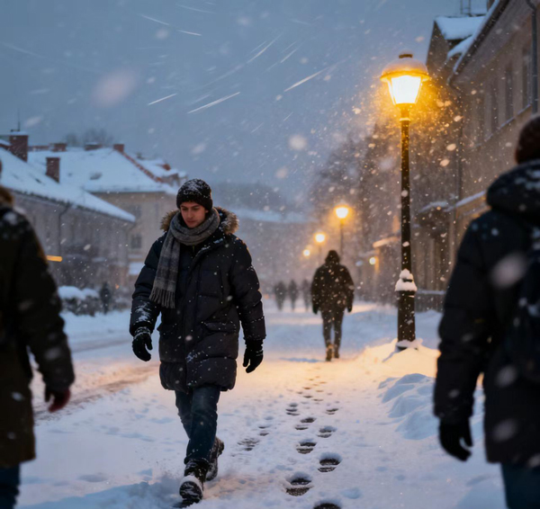 穩(wěn)字當(dāng)先 :雪天步行時,務(wù)必穿上防滑鞋,過馬路前要仔細觀察路況車情,確認安全后再通過。行走時,身體稍微前傾,像企鵝一樣邁著小碎步,這樣能降低重心,保持身體平衡,避免摔倒。總之,寧可耽誤點時間,也千萬別在濕滑的路面上疾行奔跑。