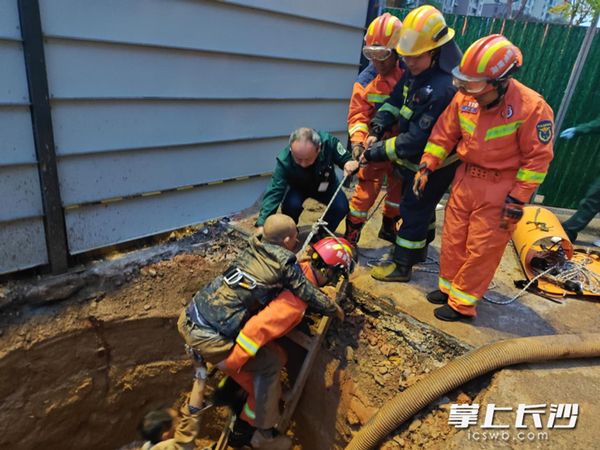 消防救援人員迅速在坑口固定金屬爬梯。一名救援人員系好安全繩、扣緊腰帶,沿梯下至積水區(qū)域,為工人固定好安全腰帶,將其穩(wěn)妥背在背上,上方隊(duì)員則拉緊安全繩全程保護(hù)。下午5時51分,經(jīng)過14分鐘的緊張施救,傷者被成功救出,并移交現(xiàn)場120醫(yī)護(hù)人員送往醫(yī)院進(jìn)一步救治。