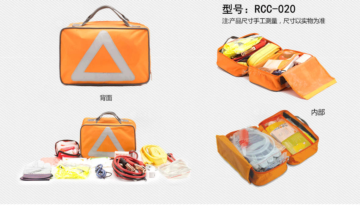 | 型號:RCC-020車載應(yīng)急包 | 材質(zhì):600D滌綸 | 顏色:橘黃 | ||||||