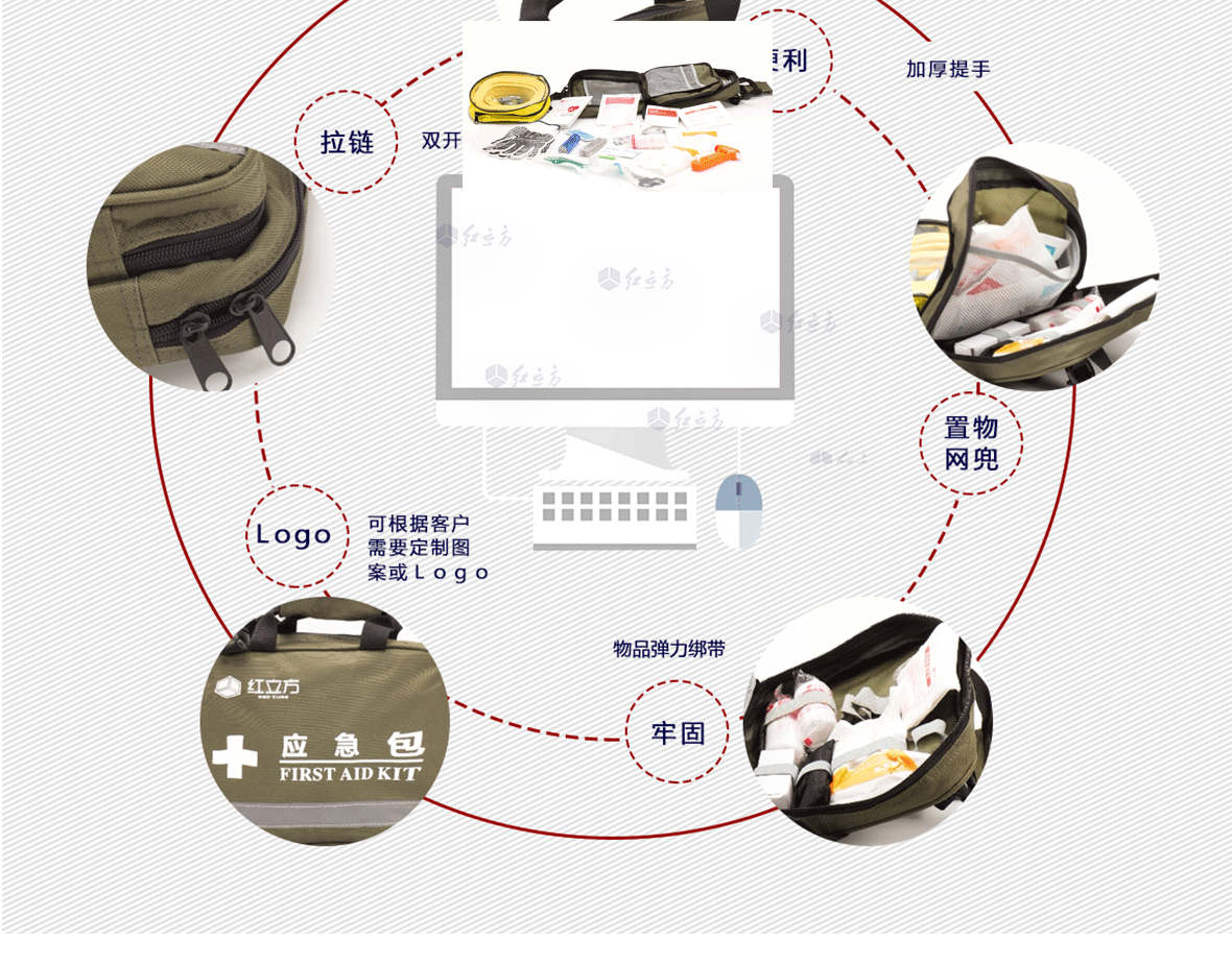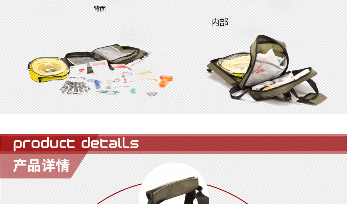 | 型號:RCC-002車載標準型應(yīng)急包 | 外包:滌綸 | 顏色:紅、綠 | ||||||